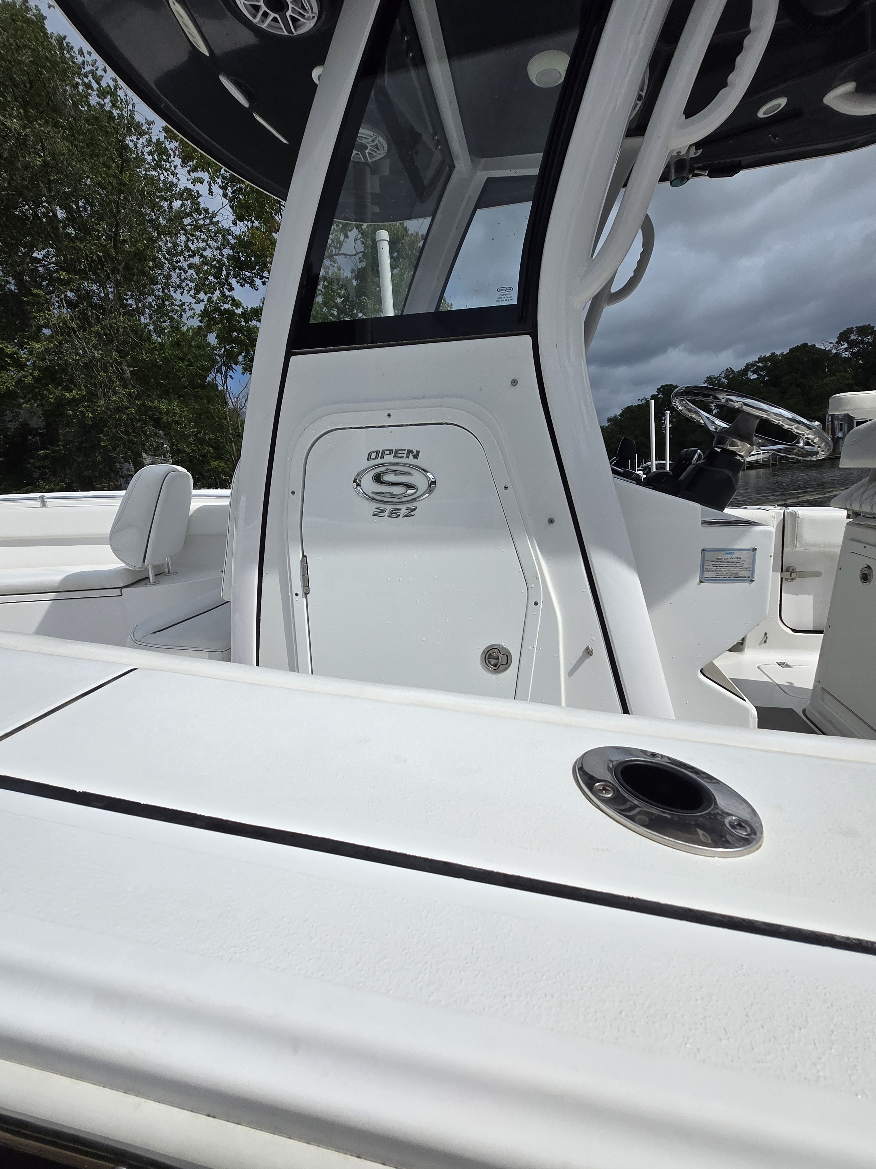 Climbing on-board the Open 262, you are met with amenities you've never seen on a 26 foot boat. Starting with the dual side entry doors which open 180-degrees for unobstructed water-centric access. For shade, a feature-packed fiberglass hard-top with lights, speakers and rod holders. At the helm, state-of-the-art standard electronics and protection all the way around thanks to the integrated tempered glass windshield. Gorgeous twin aquarium livewells at the transom accompany the fishing-ready cockpit layout. And let's not forget, a modern finely-tuned hull with superior ride designed for the latest engines.